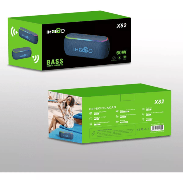 Desfrute de um som de alta qualidade com a caixa de som Imenso Modelo X82, que combina design elegante e tecnologia avançada. Com sua potência de 60W e tecnologia Super Graves, cada música é uma experiência imersiva. O robusto X82 suporta até 15 horas de reprodução graças à sua bateria de 5000mAh, permitindo que você leve sua música para qualquer lugar sem preocupações.