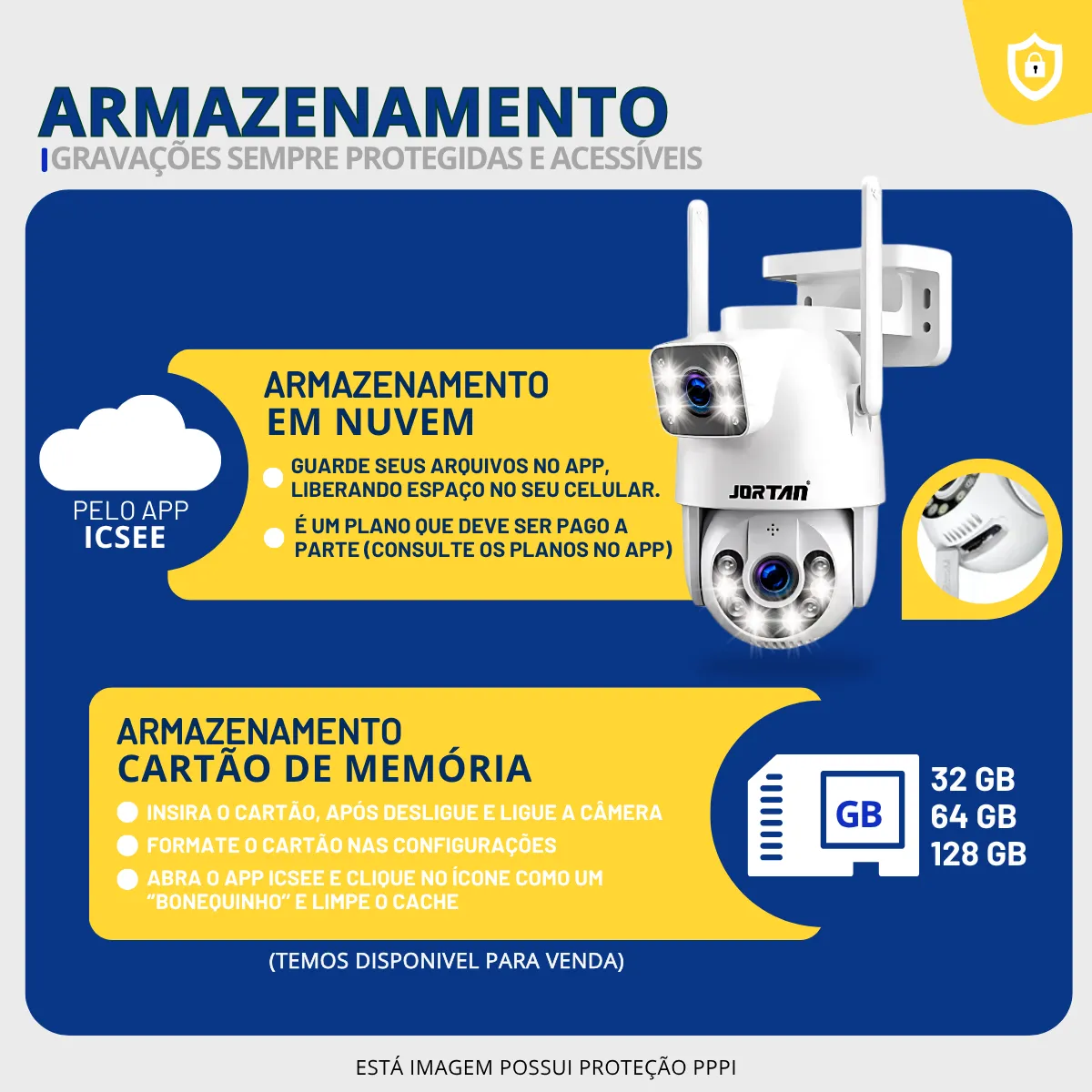 Armazenamento Flexível: Escolha a opção que melhor se adapta às suas necessidades: utilize um cartão MicroSD de até 128GB (não incluso) para gravação local ou opte pelo armazenamento seguro na nuvem através do Cloud Drive (serviço contratado separadamente no app).