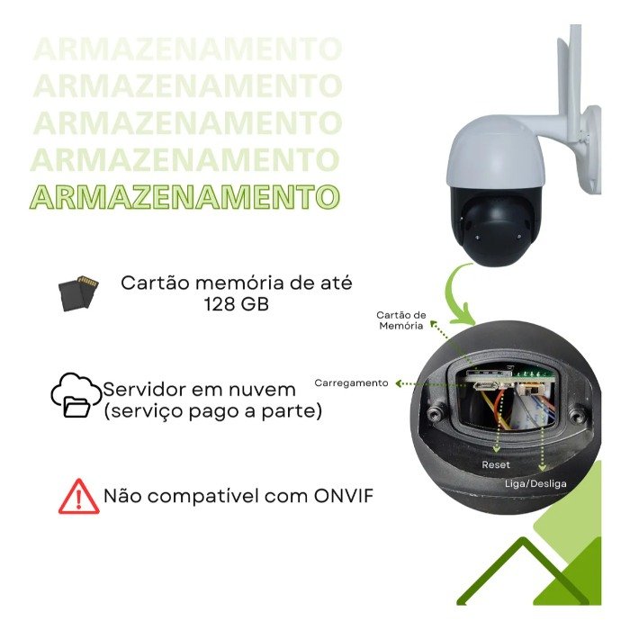 Armazenamento em nuvem ou cartão micro SD: Permite o armazenamento das gravações em um serviço de nuvem ou em um cartão de memória inserido na câmera no máximo 128Gb ( NÃO INCLUSO )