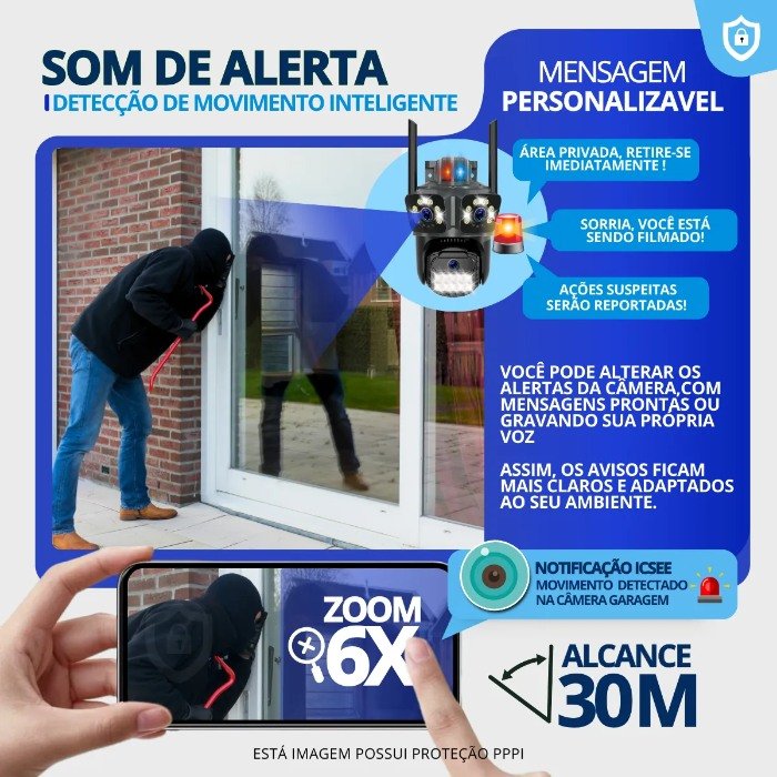 Alerta Sonoro Personalizado: Vá além da sirene tradicional! Com o alerta de sirene configurável, você pode gravar sua própria voz ou mensagem personalizada para ser reproduzida em caso de detecção de movimento, tornando o alerta ainda mais eficaz e intimidador.