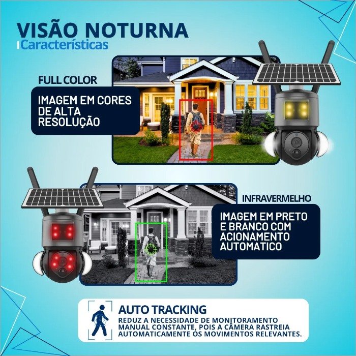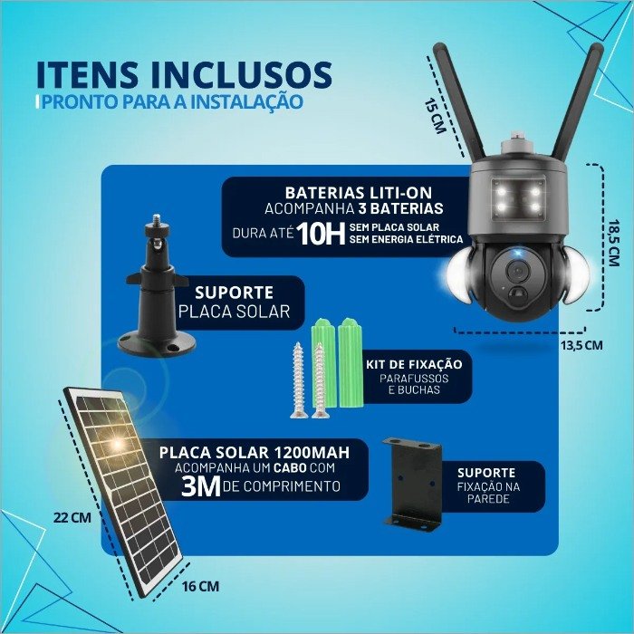 Painel solar integrado e bateria de 12000mAh garantem funcionamento contínuo, mesmo sem energia elétrica.