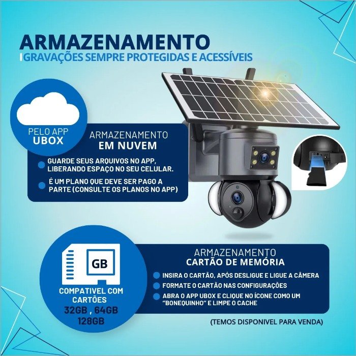 Grave vídeos em cartão de memória de até 128GB ou na nuvem (serviço pago à parte).