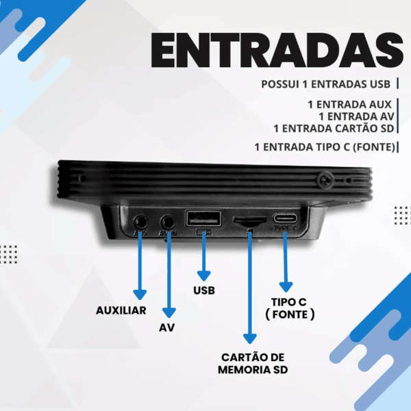 * Entrada para Pendrive e Cartão Micro SD para reproduções de áudio e vídeo