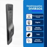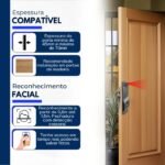 Funcionamento: Para abrir basta usar o celular, colocar a digital ou digitar a sua senha ou aproximar o cartão de proximidade ou usar a chave mecânica. Possui trava interna para maior privacidade impedindo a abertura por fora. Veja pelo seu celular quem tocou a campainha e decida abrir ou não.