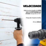 Este martelete possui uma força de impacto de 3 J e uma capacidade máxima de perfuração em madeira de 30 mm, além de 13 mm em metal. Com uma velocidade máxima de rotação de 1200 rpm e 5000 batidas por minuto, você pode escolher entre três modos de operação: furar sem percussão, furar com percussão e cinzelar, adaptando-se a diferentes necessidades de trabalho.