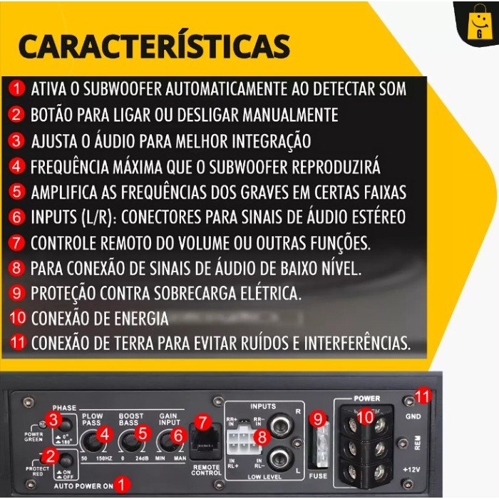 . Controle de Áudio: Ajuste preciso do nível de áudio e graves com o controle de ganho, permitindo uma personalização do som conforme sua preferência.