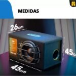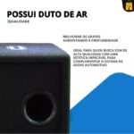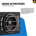 Possui amplificador integrado, eliminando a necessidade de módulos adicionais. Sua estrutura em MDF garante alta resistência à umidade e proteção contra cupins, enquanto o design slim com acabamento em fibra de carbono proporciona um visual moderno e encaixe perfeito até debaixo do banco.
