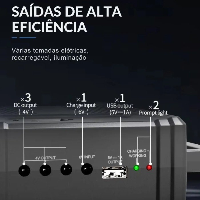 • Saída CC de 4V: Energia estável para uma ampla gama de dispositivos eletrônicos, incluindo smartphones, câmeras e muito mais.