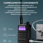Uma das grandes vantagens é o carregamento via USB Tipo-C, que permite recarregar o rádio em qualquer lugar—seja no carro, em power banks ou em carregadores de celular. Prático para quem está sempre em movimento!